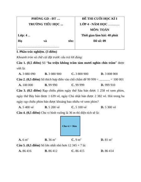 Câu 1. (0,5 điểm) Số “ba triệu không trăm tám mươi nghìn chín trăm” được viết là: A. 3 080 090 B. 3 080 900 C. 3 800 900 D. 3 008 900