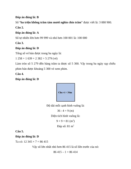 Số tự nhiên lớn hơn 99 999 và nhỏ hơn 100 001 là: 100 000 Câu 3. Đáp án đúng là: D