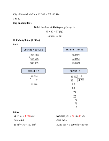 Câu 5. (0,5 điểm) Số lớn nhất nhỏ hơn 12 345 × 7 là: A. 86 416 B. 86 412 C. 86 415 D. 86 414