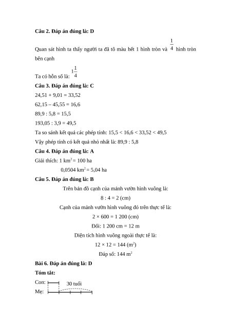 Câu 3. Trong các phép tính dưới đây, phép tính có kết quả nhỏ nhất là: A. 24,51 + 9,01 B. 62,15 – 45,55 C. 89,9 : 5,8 D. 193,05 : 3,9