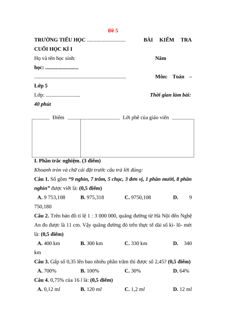 Đề thi cuối kì 1 Toán lớp 5 Cánh diều (Đề 5)