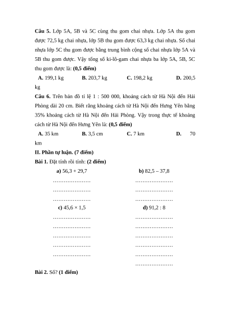 Bài 1. Đặt tính rồi tính: (2 điểm) a) 56,3 + 29,7 b) 82,5 – 37,8 ………………… ………………… ………………… ………………… ………………… ………………… c) 45,6 × 1,5 d) 91,2 : 8 ………………… ………………… ………………… ………………… ………………… ………………… ………………… ………………… ………………… ………………… …………………