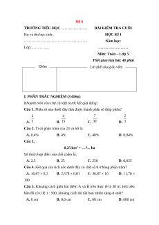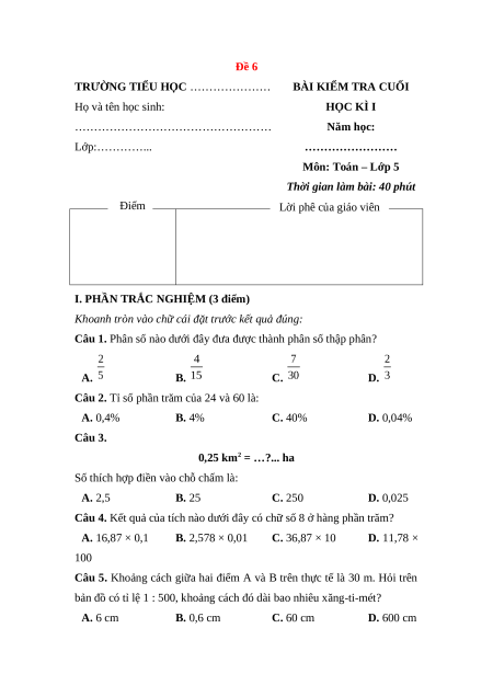 Câu 2. Tỉ số phần trăm của 24 và 60 là: A. 0,4% B. 4% C. 40% D. 0,04% Câu 3. 0,25 km2 = …?... ha