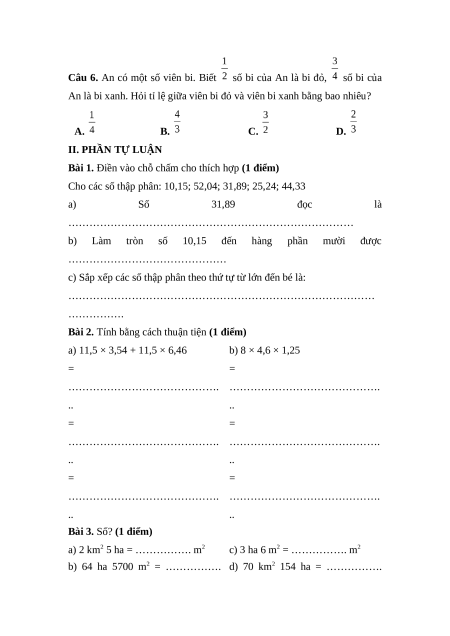 An là bi xanh. Hỏi tỉ lệ giữa viên bi đỏ và viên bi xanh bằng bao nhiêu? A. B. C. D. II. PHẦN TỰ LUẬN