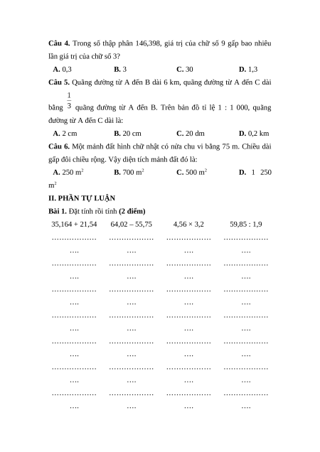 Bài 1. Đặt tính rồi tính (2 điểm) 35,164 + 21,54 64,02 – 55,75 4,56 × 3,2 59,85 : 1,9 ……………… ……………… ……………… ……………… …. …. …. …. ……………… ……………… ……………… ……………… …. …. …. …. ……………… ……………… ……………… ……………… …. …. …. …. ……………… ……………… ……………… ……………… …. …. …. …. ……………… ……………… ……………… ……………… …. …. …. …. ……………… ……………… ……………… ……………… …. …. …. …. ……………… ……………… ……………… ……………… …. …. …. ….