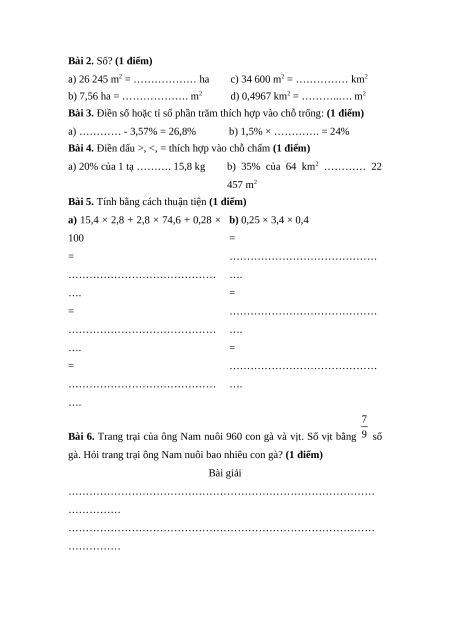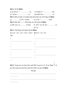 Bài 3. Điền số hoặc tỉ số phần trăm thích hợp vào chỗ trống: (1 điểm)