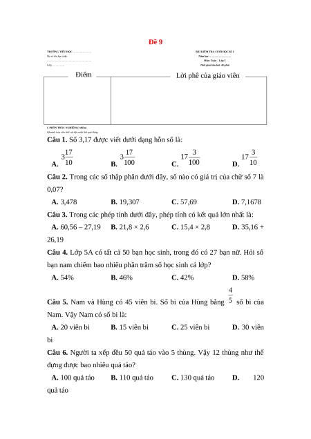 Đề thi cuối kì 1 Toán lớp 5 Cánh diều (Đề 9)
