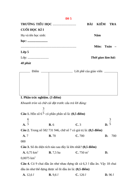 Đề thi Cuối kì 1 Toán lớp 5 Kết nối tri thức (Đề 5)