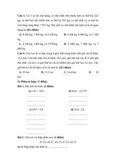 Bài 1. Đặt tính rồi tính: (2 điểm) a) 1,32 + 34,5 b) 45,8 – 12,757 ………………… ………………… ………………… ………………… ………………… ………………… c) 4,67 × 5,8 d) 33,6 : 5,6 ………………… ………………… ………………… ………………… ………………… ………………… ………………… …………………