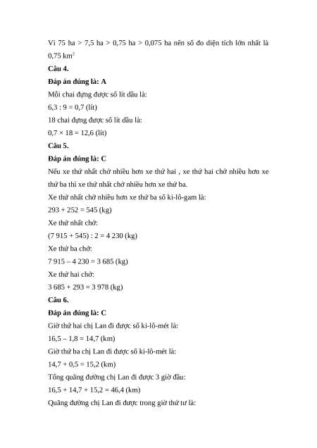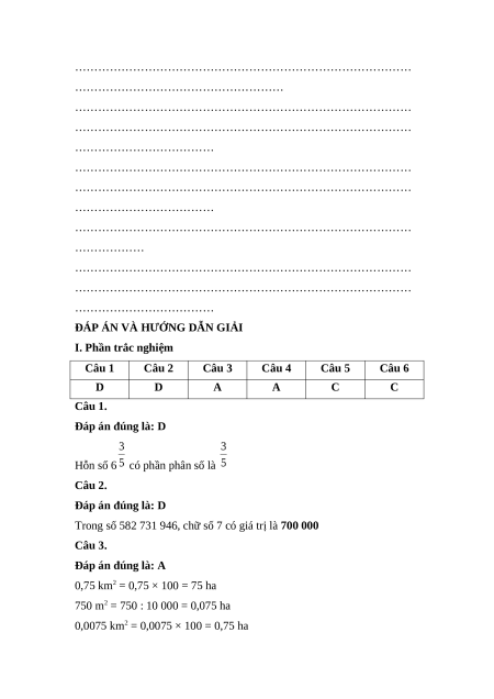 Trong số 582 731 946, chữ số 7 có giá trị là 700 000 Câu 3. Đáp án đúng là: A 0,75 km2 = 0,75 × 100 = 75 ha