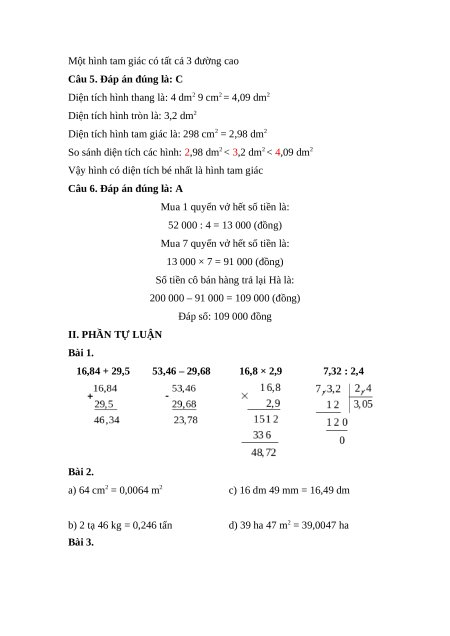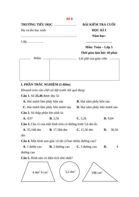 Câu 5. Hình nào có diện tích nhỏ nhất? 4 dm2 9 cm2 3,2 dm2 298 cm2 A. Hình tròn B. Hình thang C. Hình tam giác