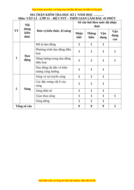 Các đặc trưng vật lí của 1 1 1 sóng 2 Sóng Sóng điện từ 1 1 1 Giao thoa sóng 1 1 1 1 Sóng dừng 1 1 1 Tổng số câu 9 9 9 3