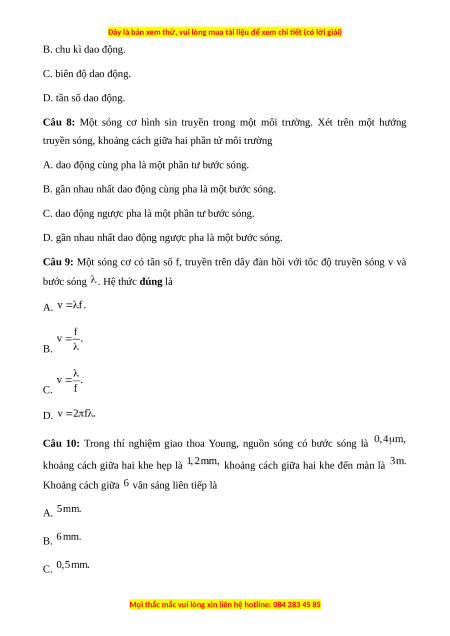 Câu 9: Một sóng cơ có tần số f, truyền trên dây đàn hồi với tốc độ truyền sóng v và