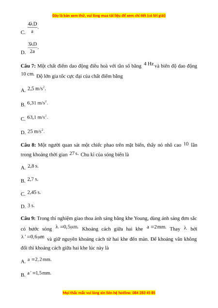 Câu 6: Trong thí nghiệm Y-âng về giao thoa ánh sáng, nguồn sáng đơn sắc với bước