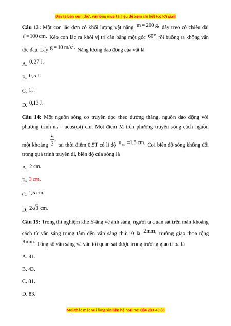 Câu 13: Một con lắc đơn có khối lượng vật nặng dây treo có chiều dài