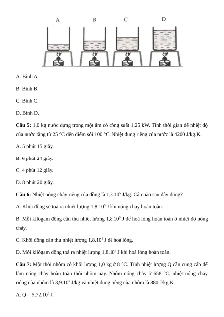 Câu 4: Có 4 bình A, B, C, D đều đựng nước ở cùng một nhiệt độ với thể tích tương ứng