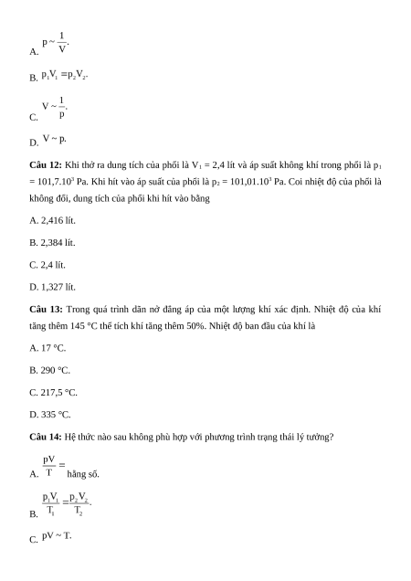 Câu 12: Khi thở ra dung tích của phổi là V1 = 2,4 lít và áp suất không khí trong phổi là p1
