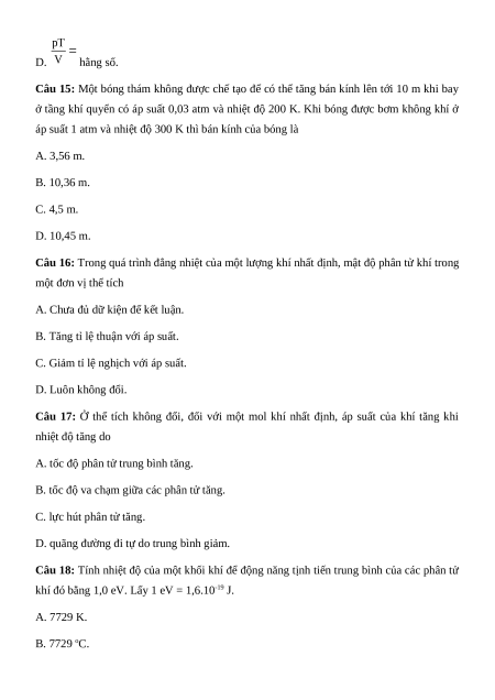 Câu 14: Hệ thức nào sau không phù hợp với phương trình trạng thái lý tưởng? A. hằng số. B. C.