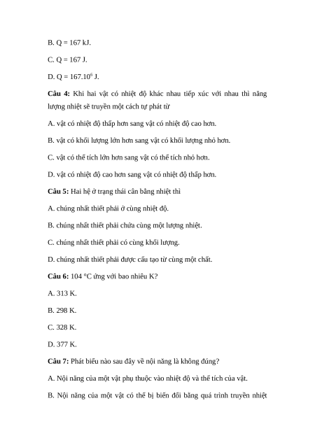 Câu 6: 104 °C ứng với bao nhiêu K? A. 313 K. B. 298 K. C. 328 K. D. 377 K.