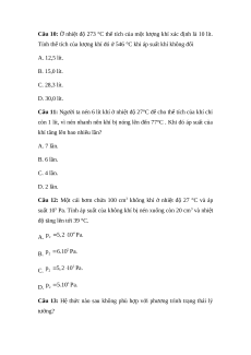 Câu 10: Ở nhiệt độ 273 °C thể tích của một lượng khí xác định là 10 lít.