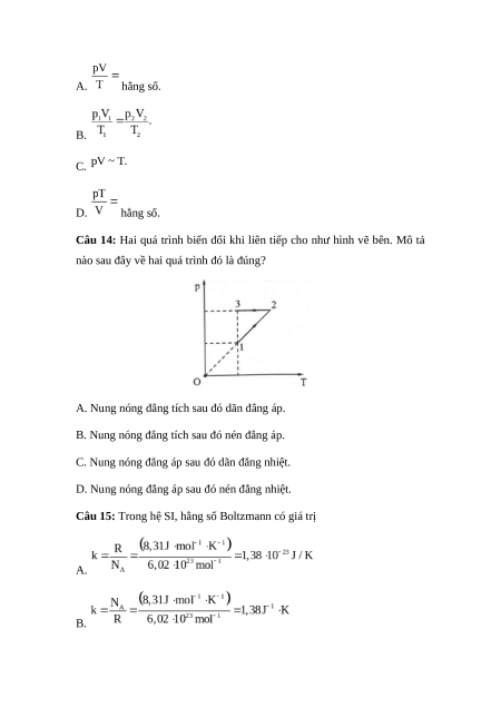 Câu 13: Hệ thức nào sau không phù hợp với phương trình trạng thái lý tưởng?