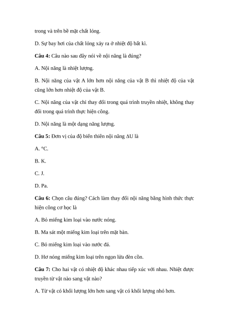 Câu 5: Đơn vị của độ biến thiên nội năng U là A. °C. B. K. C. J. D. Pa.