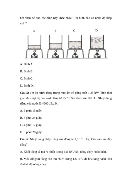 Câu 4: Có 4 bình A, B, C, D đều đựng nước ở cùng một nhiệt độ với thể
