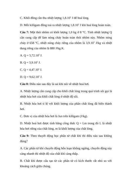 Câu 6: Nhiệt nóng chảy riêng của đồng là 1,8.105 J/kg. Câu nào sau đây đúng?
