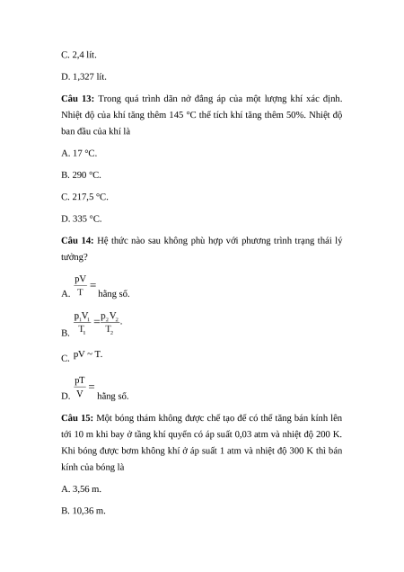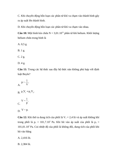 Câu 12: Khi thở ra dung tích của phổi là V1 = 2,4 lít và áp suất không khí