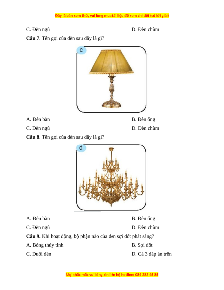 Câu 9. Khi hoạt động, bộ phận nào của đèn sợi đốt phát sáng? A. Bóng thủy tinh B. Sợi đốt C. Đuôi đèn D. Cả 3 đáp án trên