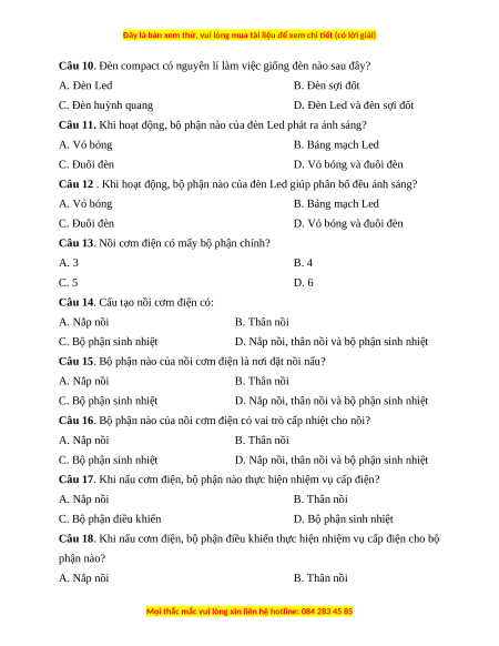 Câu 10. Đèn compact có nguyên lí làm việc giống đèn nào sau đây? A. Đèn Led B. Đèn sợi đốt C. Đèn huỳnh quang