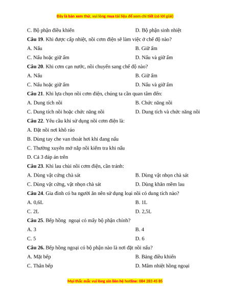 Câu 19. Khi được cấp nhiệt, nồi cơm điện sẽ làm việc ở chế độ nào? A. Nấu B. Giữ ấm C. Nấu hoặc giữ ấm D. Nấu và giữ ấm