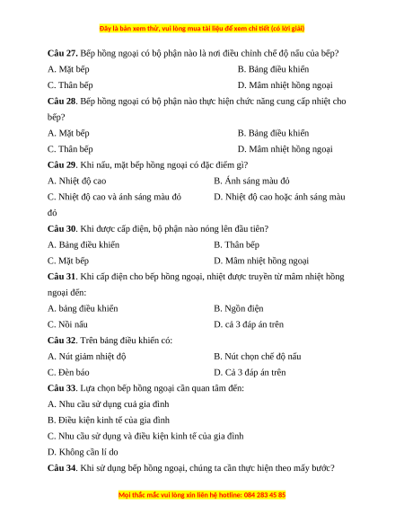 Câu 25. Bếp hồng ngoại có mấy bộ phận chính? A. 3 B. 4 C. 5 D. 6