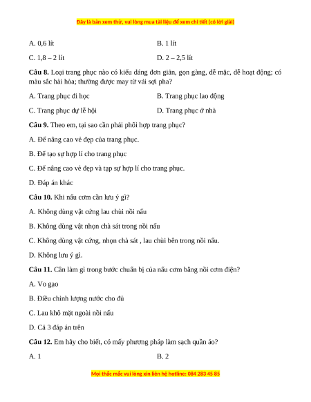 Câu 12. Em hãy cho biết, có mấy phương pháp làm sạch quần áo? A. 1 B. 2