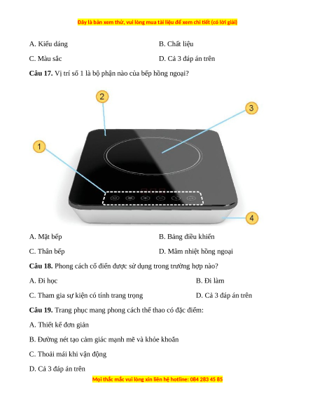 Câu 17. Vị trí số 1 là bộ phận nào của bếp hồng ngoại? A. Mặt bếp B. Bảng điều khiển C. Thân bếp D. Mâm nhiệt hồng ngoại