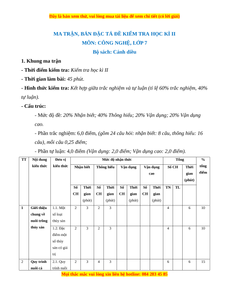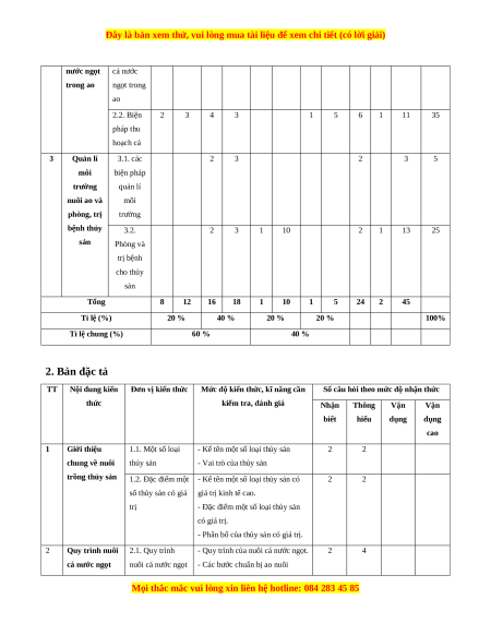 nước ngọt cá nước trong ao ngọt trong ao 2.2. Biện 2 3 4 3 1 5 6 1 11 35 pháp thu hoạch cá 3 Quản lí 3.1. các 2 3 2 3 5 môi biện pháp trường quản lí nuôi ao và môi phòng, trị trường bệnh thủy 3.2. 2 3 1 10 2 1 13 25 sản Phòng và trị bệnh cho thủy sản Tổng 8 12 16 18 1 10 1 5 24 2 45 Tỉ lệ (%) 20 % 40 % 20 % 20 % 100% Tỉ lệ chung (%) 60 % 40 % 2. Bản đặc tả TT Nội dung kiến
