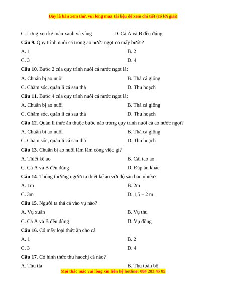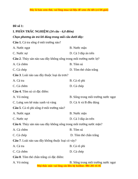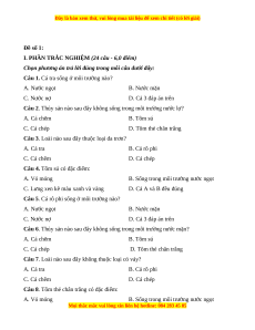 Câu 1. Cá tra sống ở môi trường nào? A. Nước ngọt B. Nước mặn C. Nước nợ D. Cả 3 đáp án trên