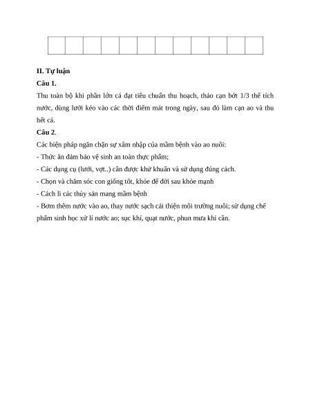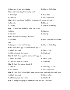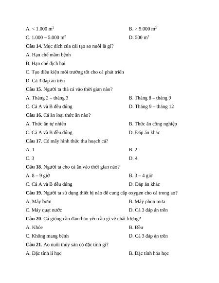 Câu 15. Người ta thả cá vào thời gian nào? A. Tháng 2 – tháng 3 B. Tháng 8 – tháng 9 C. Cả A và B đều đúng D. Tháng 9 – tháng 12