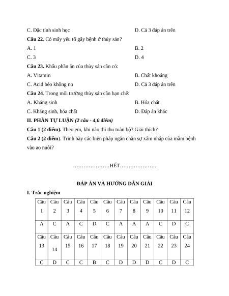 Câu 24. Trong môi trường thủy sản cần hạn chế: A. Kháng sinh B. Hóa chất C. Kháng sinh, hóa chất D. Đáp án khác