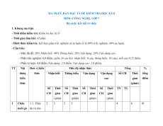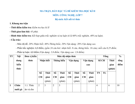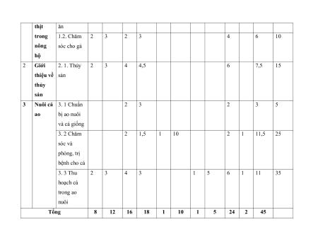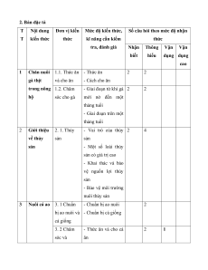 CH gian CH gian CH gian CH gian (phút) (phút) (phút) (phút) 1 Chăn 1.1. Thức 2 3 2 3 4 6 10 nuôi gà ăn và cho thịt ăn trong 1.2. Chăm 2 3 2 3 4 6 10 nông sóc cho gà hộ 2 Giới 2. 1. Thủy 2 3 4 4,5 6 7,5 15 thiệu về sản thủy sản 3 Nuôi cá 3. 1 Chuẩn 2 3 2 3 5 ao bị ao nuôi và cá giống 3. 2 Chăm 2 1,5 1 10 2 1 11,5 25 sóc và phòng, trị bệnh cho cá 3. 3 Thu 2 3 4 3 1 5 6 1 11 35 hoạch cá trong ao nuôi Tổng 8 12 16 18 1 10 1 5 24 2 45 Tỉ lệ (%) 20 % 40 % 20 % 20 % 100% Tỉ lệ chung (%) 60 % 40 % 2. Bản đặc tả T Nội dung
