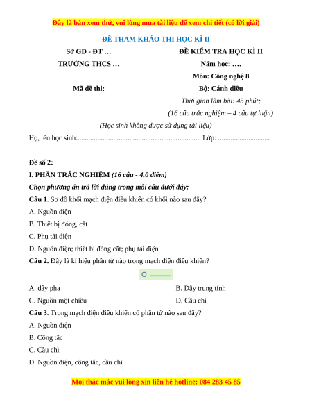 ĐỀ KIỂM TRA HỌC KÌ II TRƯỜNG THCS … Năm học: …. Môn: Công nghệ 8 Mã đề thi: Bộ: Cánh diều