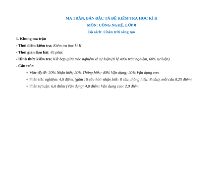 - Tailieugiaovien.com.vn giới thiệu 2 đề cuối kì 2 gồm đầy đủ ma trận và lời giải chi tiết môn Công nghệ 8 Chân trời sáng tạo mới nhất năm 2024 nhằm giúp Giáo viên có thêm tài liệu tham khảo ra đề thi Công nghệ lớp 8.