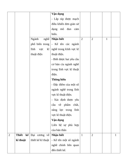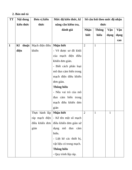 Mức độ nhận thức Tổng Thời Thông Vận dụng Nhận biết Vận dụng Số CH gian hiểu cao % Nội dung Đơn vị kiến (phút) TT tổng kiến thức thức Thời Thời Thời Thời điểm Số Số gian Số Số gian gian gian TN TL CH CH (phút CH CH (phút) (phút) (phút) ) Mạch điện điều 2 1,5 1 0,75 3 2,25 7,5% khiển Thực hành lắp ráp mạch điện Kĩ thuật 2 1,5 1 0,75 1 10 3 1 12,25 27,5% 1 điều khiển đơn điện giản Ngành nghề phổ biến trong lĩnh 2 1,5 2 1,5 1 10 4 1 13 30% vực kĩ thuật điện 2 Thiết kế Đại cương về 1 0,75 2 3 1 5 3 1 8,75 17,5% kĩ thuật thiết kế kĩ thuật Quy trình thiết 1 0,75 2 3 1 5 3 1 8,75 17,5% kế kĩ thuật Tổng 8 6 8 9 2 20 2 10 16 4 45 Tỉ lệ (%) 20 % 20 % 40 % 20 % 100% Tỉ lệ chung (%) 40 % 60 % 2. Bản mô tả TT Nội dung Đơn vị kiến