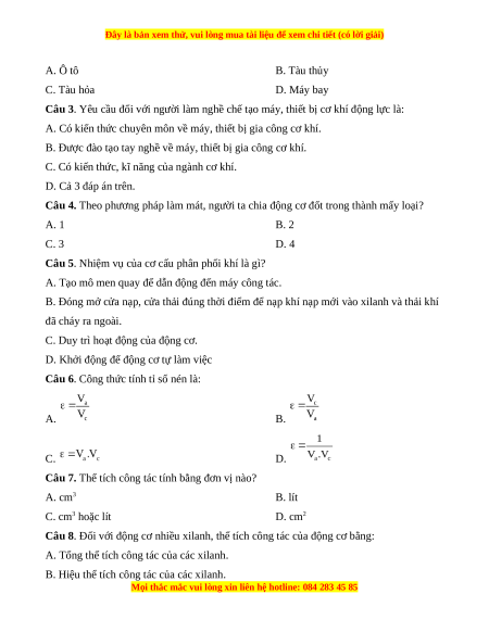 Câu 7. Thể tích công tác càng lớn thì công suất của động cơ: A. Càng lớn B. Càng nhỏ C. Trung bình D. Không có mối liên hệ