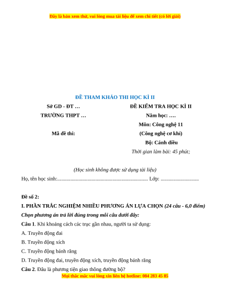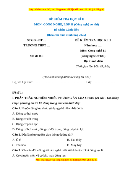 ĐỀ KIỂM TRA HỌC KÌ II TRƯỜNG THPT … Năm học: …. Môn: Công nghệ 11 Mã đề thi: (Công nghệ cơ khí) Bộ: Cánh diều