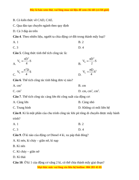 Câu 4. Theo nhiên liệu, người ta chia động cơ đốt trong thành mấy loại? A. 1 B. 2 C. 3 D. 4
