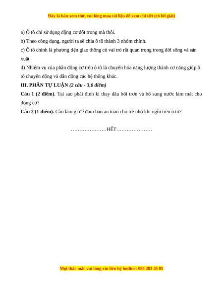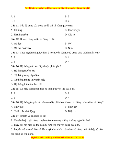 Câu 13. Theo nguồn động lực làm ô tô chuyển động, ô tô được chia thành mấy loại? A. 1 B. 2 C. 3 D. 4