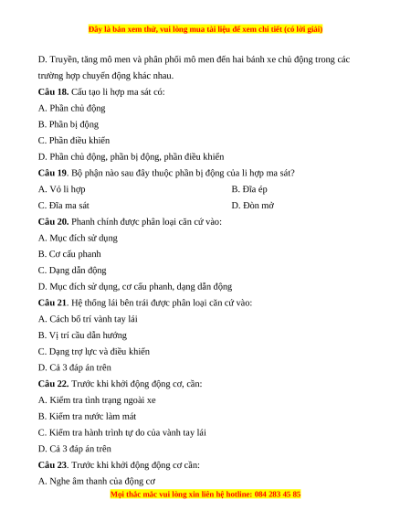 Câu 18. Cấu tạo li hợp ma sát có: A. Phần chủ động B. Phần bị động C. Phần điều khiển