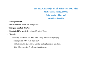 Đề thi Cuối kì 2 Công nghệ Lâm nghiệp Thủy sản 12 Cánh diều