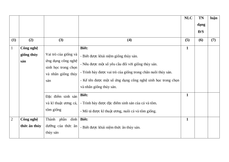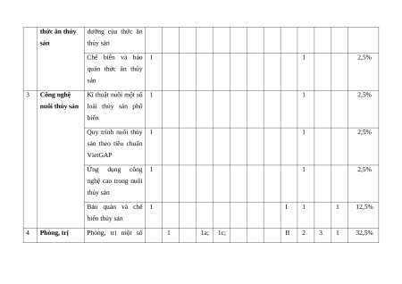 giống thủy sản ứng dụng công nghệ sinh học trong chọn và nhân giống thủy sản Đặc điểm sinh sản 1 1 2,5% và kĩ thuật ương cá, tôm giống 2 Công nghệ Thành phần dinh 1 1 2,5% thức ăn thủy dưỡng của thức ăn sản thủy sản Chế biến và bảo 1 1 2,5% quản thức ăn thủy sản 3 Công nghệ Kĩ thuật nuôi một số 1 1 2,5% nuôi thủy sản loài thủy sản phổ biến Quy trình nuôi thủy 1 1 2,5% sản theo tiêu chuẩn VietGAP Ứng dụng công 1 1 2,5% nghệ cao trong nuôi thủy sản Bảo quản và chế 1 I 1 1 12,5% biến thủy sản 4 Phòng, trị Phòng, trị một số 1 1a; 1c; II 2 3 1 32,5%